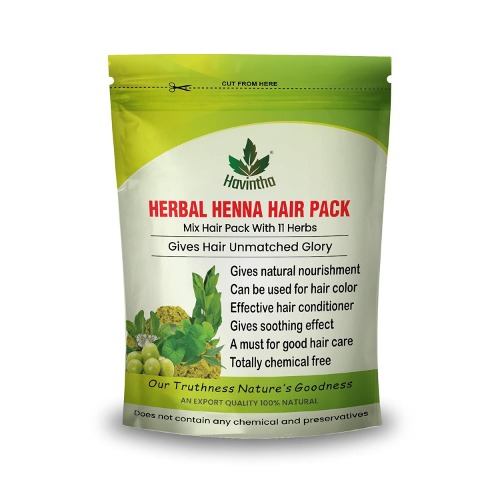 Herbal henna hair pack with 11 herbs to promote natural hair health, shine, and color enhancement without harsh chemicals.
