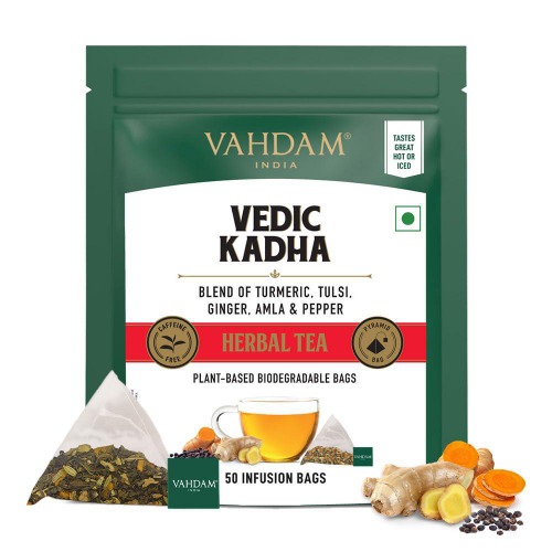 Vedic Kadha herbal tea with turmeric, ginger, and amla. Sustainably cultivated, caffeine-free, and biodegradable packaging for a rich aromatic experience.